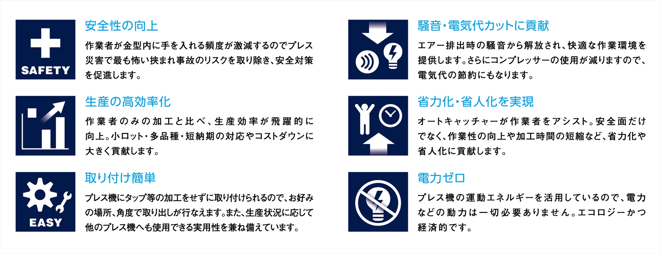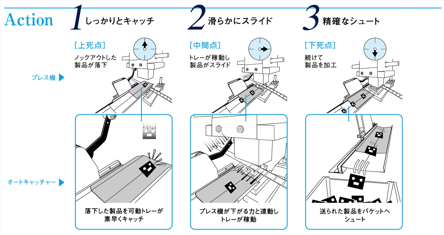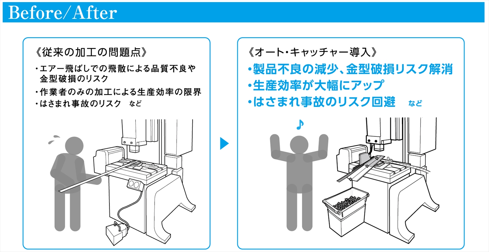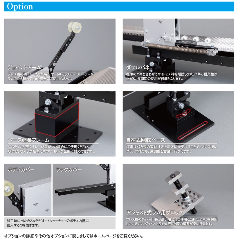 コンパウンド加工の最大の悩みである加工品の取り出し。オートキャッチャーなら簡単に確実な取り出しが行えます。さらに生産性、安全性も向上でき、現場の強い味方となります。 |